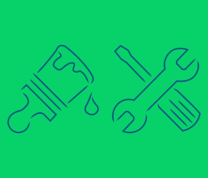 A blue outline of a paintbrush, wrench, and screwdriver on a green background, representing tools for painting and repairs.